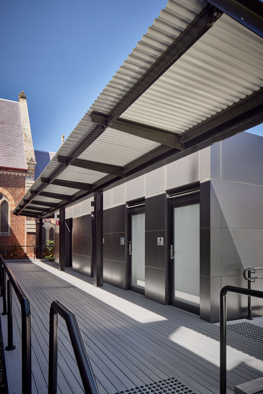 The new building provides toilets and change room facilities for students, performers and visitors, supporting the operation of the new performing arts venue while responding sensitively to the heritage character of the site.