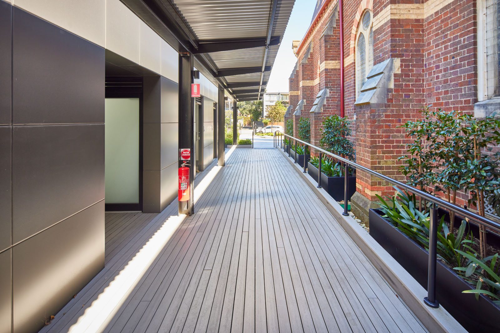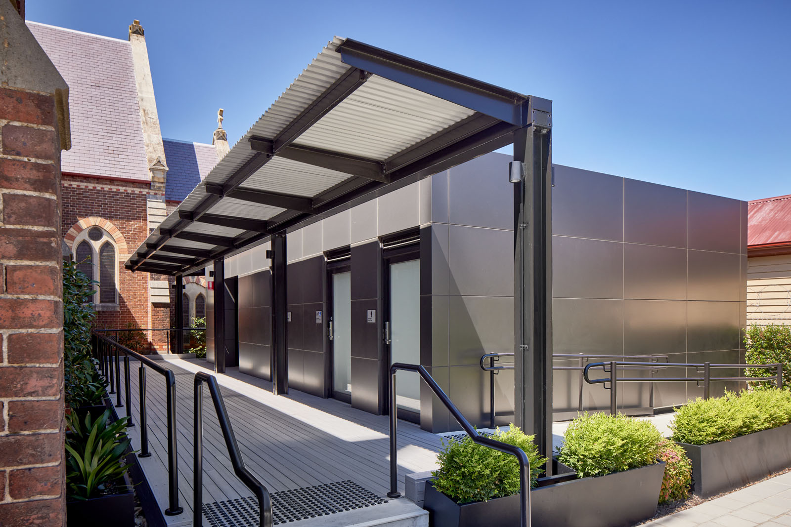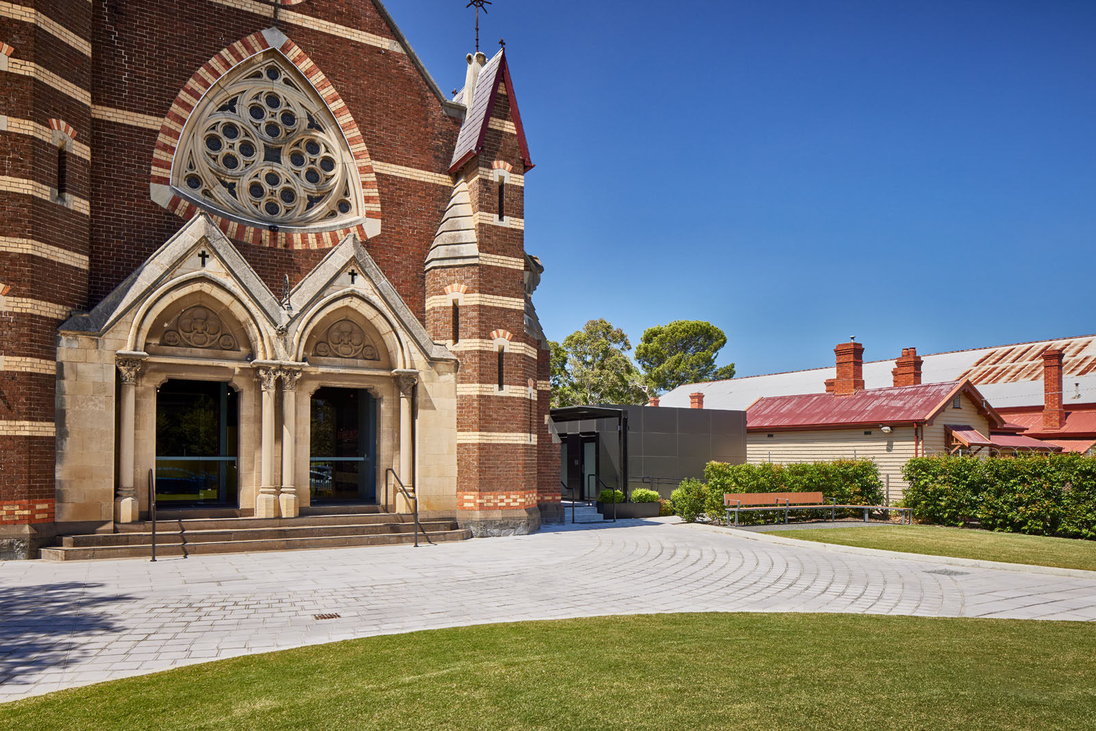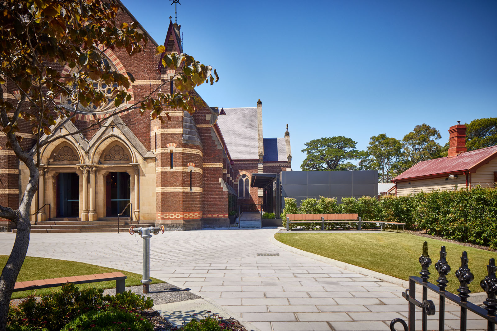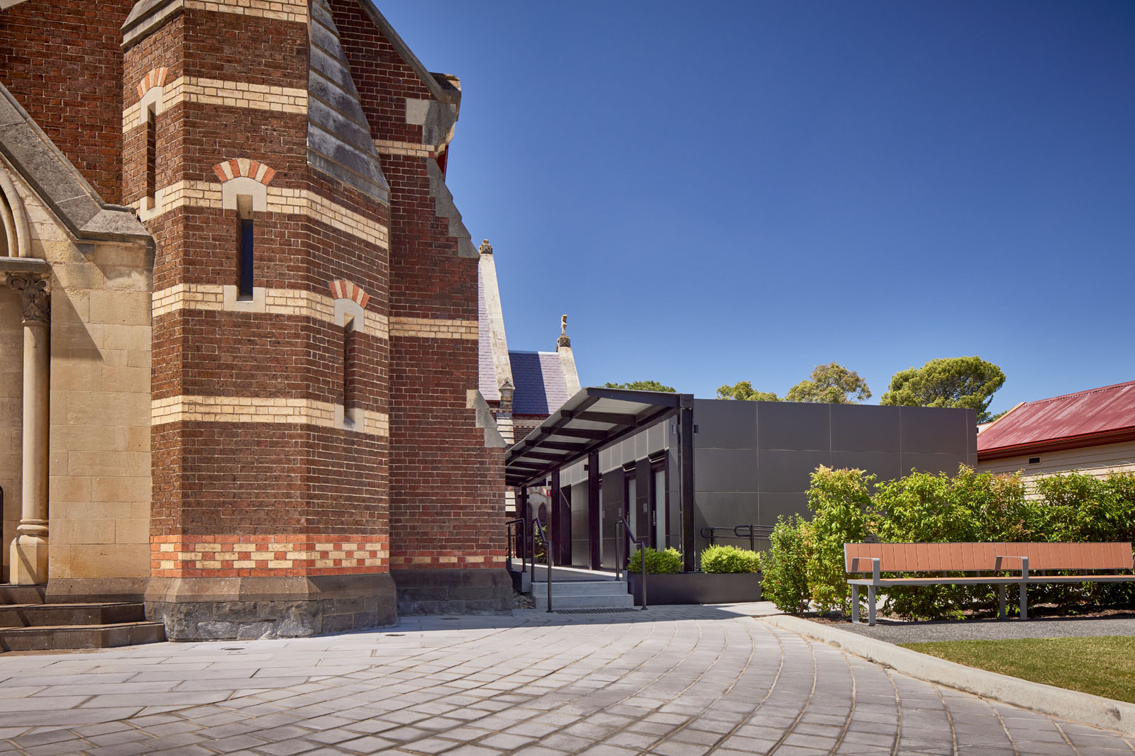 The building was carefully designed to sit comfortably within the heritage context, using a contemporary architectural language that complements rather than competes with the historic church. The scale, form and material selection were developed to ensure the new building feels appropriate within the setting and contributes positively to the broader precinct.